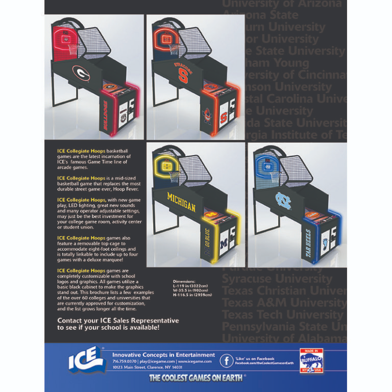 In this new mid-sized version of the ever-durable street game Collegiate Hoops boasts the latest technology such as new LED lighting, slam dunk sound effects, moving hoop, and more. See how many points you can rack up against the ticking clock!  With deluxe custom marquee options available, choose from college teams to decorate your Collegiate Hoops. Perfect for any arcade, game room or family entertainment center!