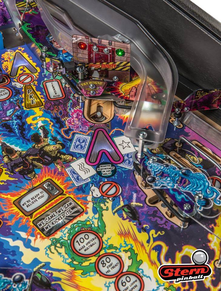 nGhostbusters pinball is designed to be easy to play but difficult to master. It features a moving interactive Slimer toy target and a fresh distinctive layout that integrates traditional pinball devices with unique multifunction two-way ramps featuring a magnetic diverter and scoring switches. In addition, the game features a modern take on a ball transfer target, combative open field drop targets, a ball eject target, a captive ball target and custom molded toys.