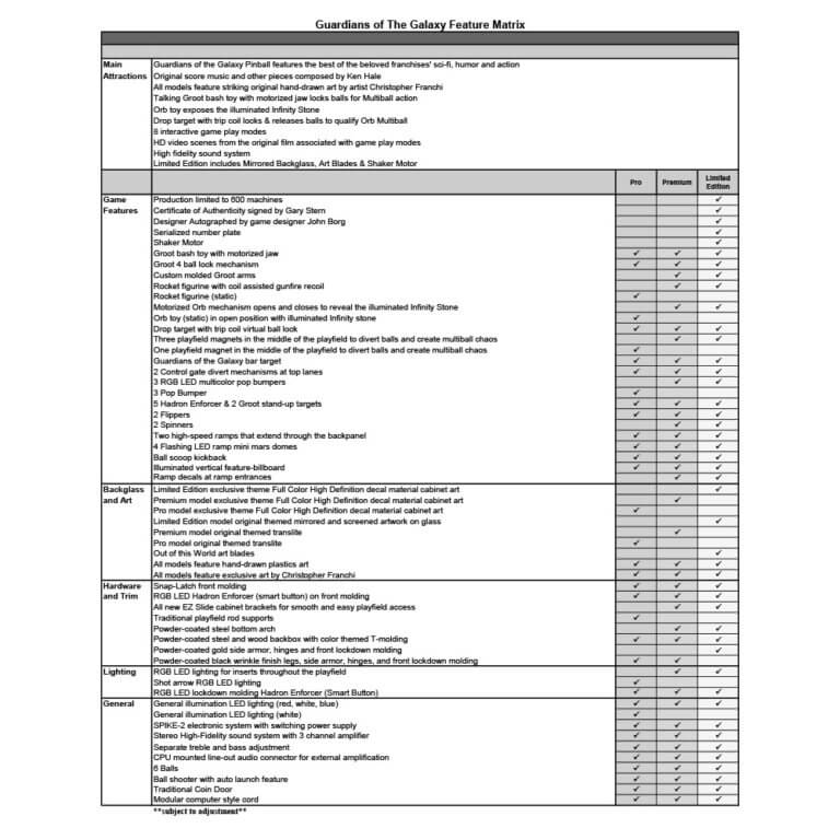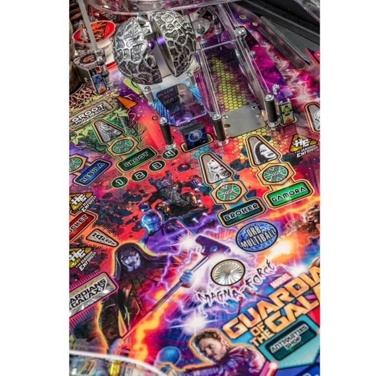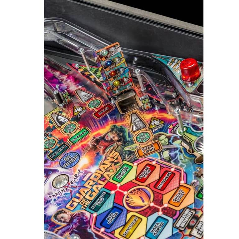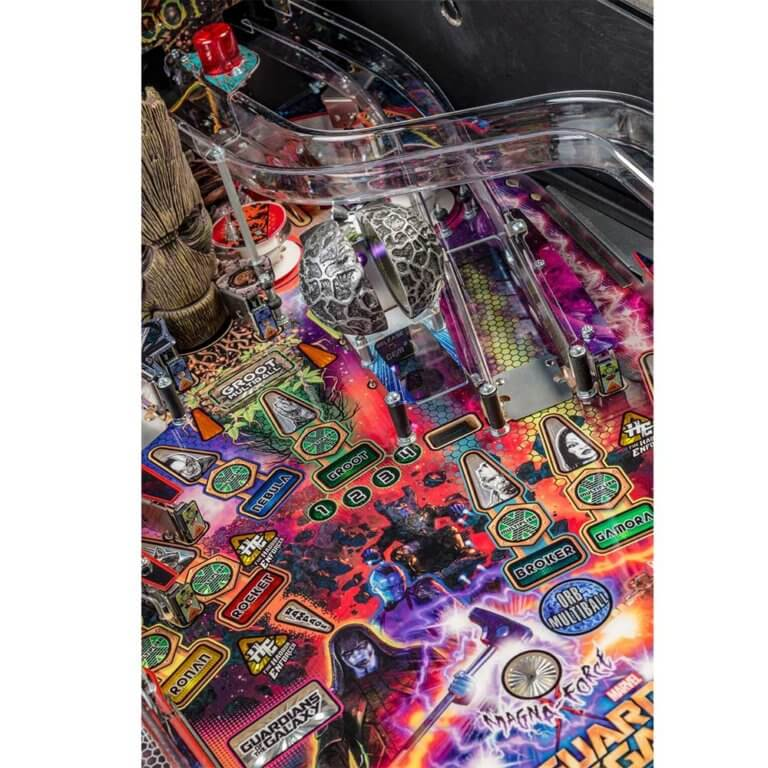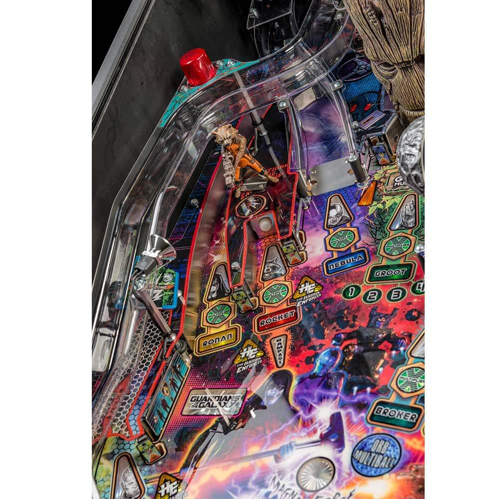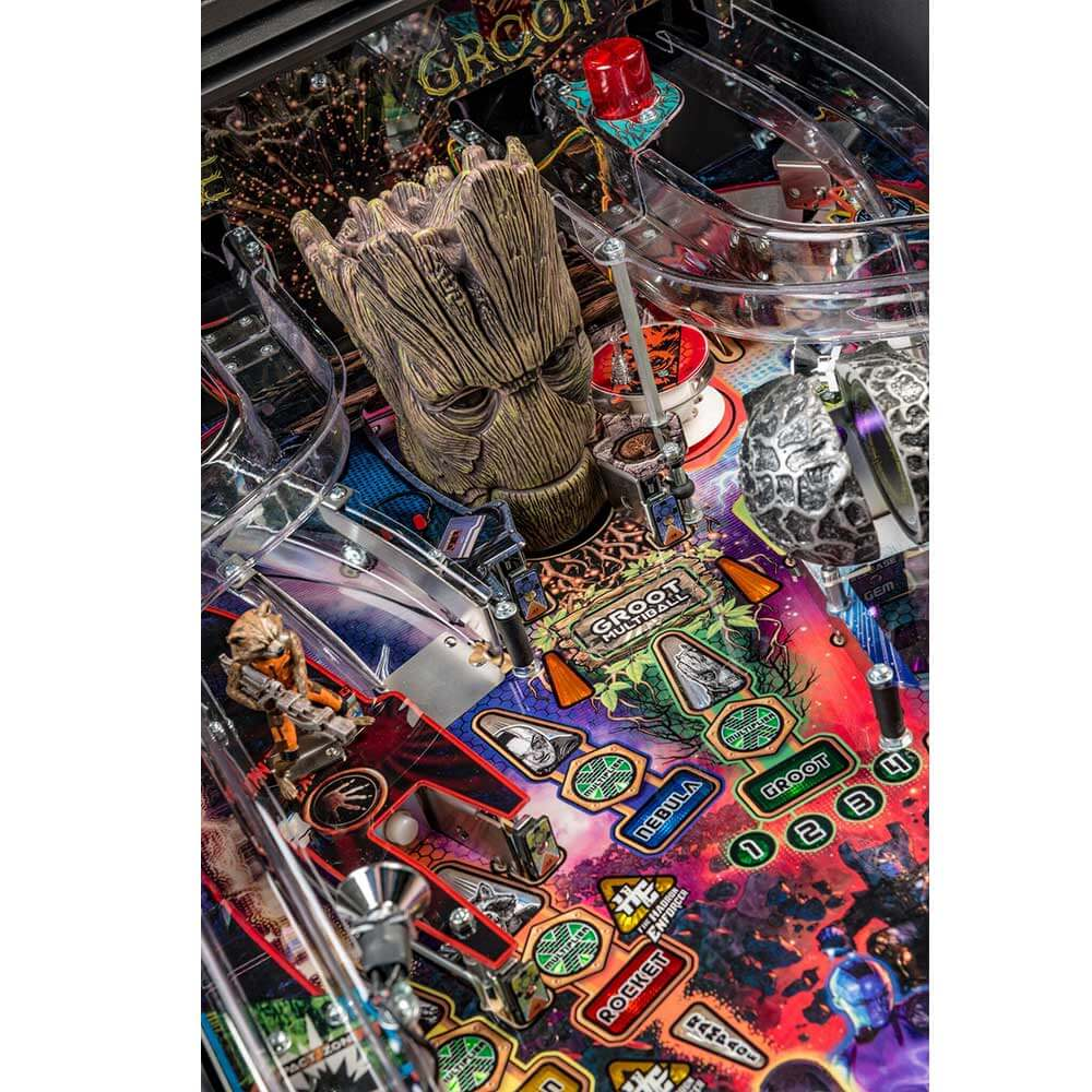 nStern’s Guardians of the Galaxy Pro model is packed with features that provide an irresistible gameplay experience. Each game features a sculpted and interactive ball-eating Groot. In addition, a custom sculpted Rocket figure will keep players on their toes as it blasts the ball back at rocket speed. Color-changing inserts highlight the mysterious and interactive Orb, which opens to reveal the powerful Infinity Stone.