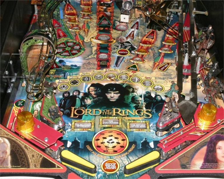 nThe Lord of the Rings pinball machine is a 2003 game designed by George Gomez and distributed by Stern Pinball. It is based on the The Lord of the Rings film trilogy, which was first released in 2001. It features the highest possible score multiplier in pinball to date: During a combined “Two Towers” and “Gollum” Multiball it is possible to achieve a 84x Jackpot (when scoring seven subsequent combo Jackpot shots, having the 2x scoring Elf gift and the Smeagol phase of Gollum Multiball running at once)!