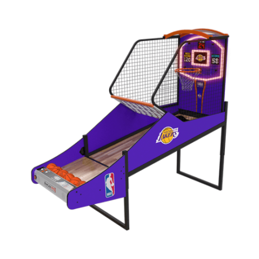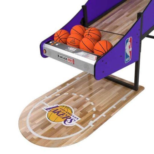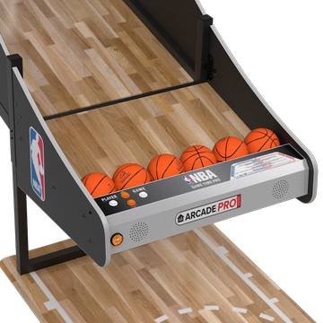 NBA Game Time Pro Basketball Arcade is ICE’s newest pop-a-shot style machine designed for a home arcade. With a real hardwood floor, and an official NBA license, you’re looking at the latest and greatest in arcade basketball that would be the perfect addition to your home arcade. Note this is the extended podium playfield of 1.5 feet (from 8 feet to 9.5 feet).nnGame Modes:nn* Arcade — The classic basketball arcade game. Players race against the clock to score as many points as possible. Score 75 to get to the 2nd round. Score 100 to get to the 3rd (final) round. See who can get the all-time high score with this arcade classic.n* Money Ball — core points by making baskets — Race against the clock to score as many points as possible. Money signs are worth bonus points. $ = 5 PTS, $$ = 10 PTSn* Pig — The classic game takes on the arcade. Players take turn attempting shots. If a player misses, they get a P, they miss a second time I and the third time they miss they will get a G and be removed from the game. Last player standing wins. Creativity is key — off the side bank shot? Blindfolded?n* Last Shot — Get as close to zero as possible. Timer counts down from three seconds. Each player gets four shots per game.nnOther Features:nn* Officially licensed NBA graphics package.n* Removable top arch to accommodate 8ft. (96″) ceilings (height is adjustable from 87″ to 101″)n* Real hardwood floorn* Up to 4 playersn* NBA LICENSE Option — choose between all 30 NBA teams (+250)n* Floor Add-on with NBA generic logo or choice of any of the 30 NBA teams (+350)n* Easy assemblynnThe Pinball Company only offers curbside delivery for basketball arcades. Inside delivery is not available for basketball arcades.
