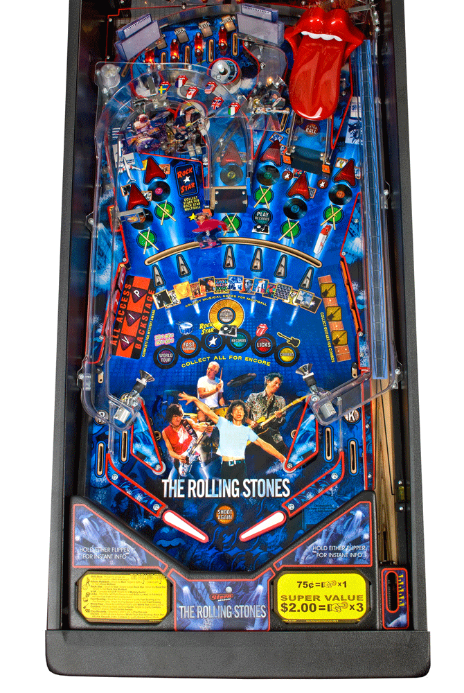 nRolling Stones pinball machine features a strutting Mick Jagger and the famous Rolling Stones lips!