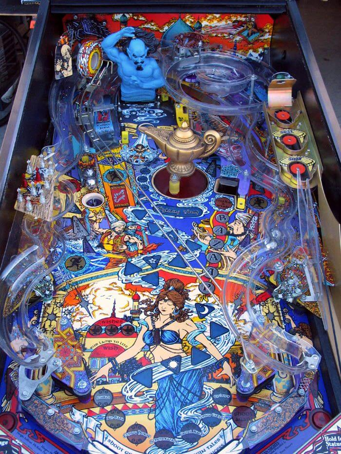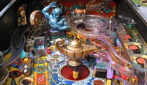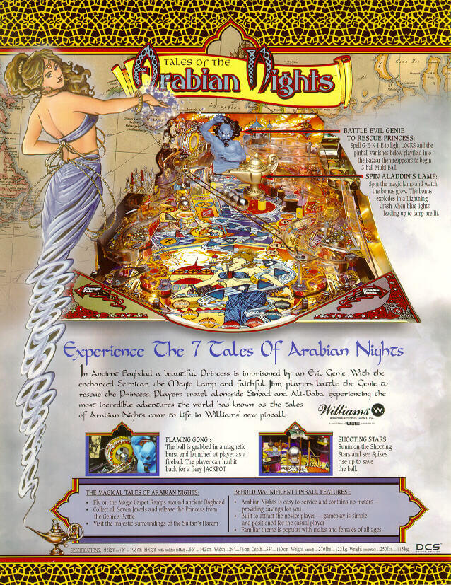 nPlayers can experience 7 Tales of the Arabian Nights that includes a travel around the ancient city of Baghdad, flying with the magic carpet and battling the evil Genie. Rubbing the magic lamp conjure good genies that help to rescue the princess. The game has a vertical magnet diverter that grabs the ball and hurls it back at the player for more suspense as an industry first. The game includes spikes that rises up and save the ball when the shooting stars are summoned.