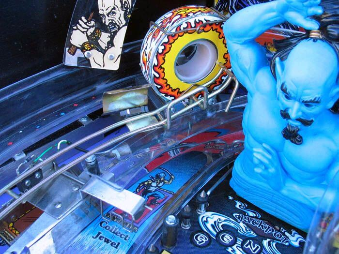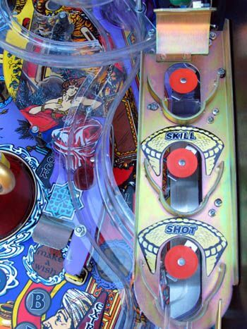 nFlippers (2), Pop bumpers (3), Slingshots (2), Spinning posts (2), Captive balls (2), Kick-out hole (1), Electromagnet (1), 2- 3- and 4-ball multiball, Shooter lane skill shot. The top of each flipper inlane has a circle of metal “spikes” that can rise up from within the playfield to temporarily encircle the ball and stop it from exiting the outlane. Lamp on top of spinning posts. Genie bash toy.