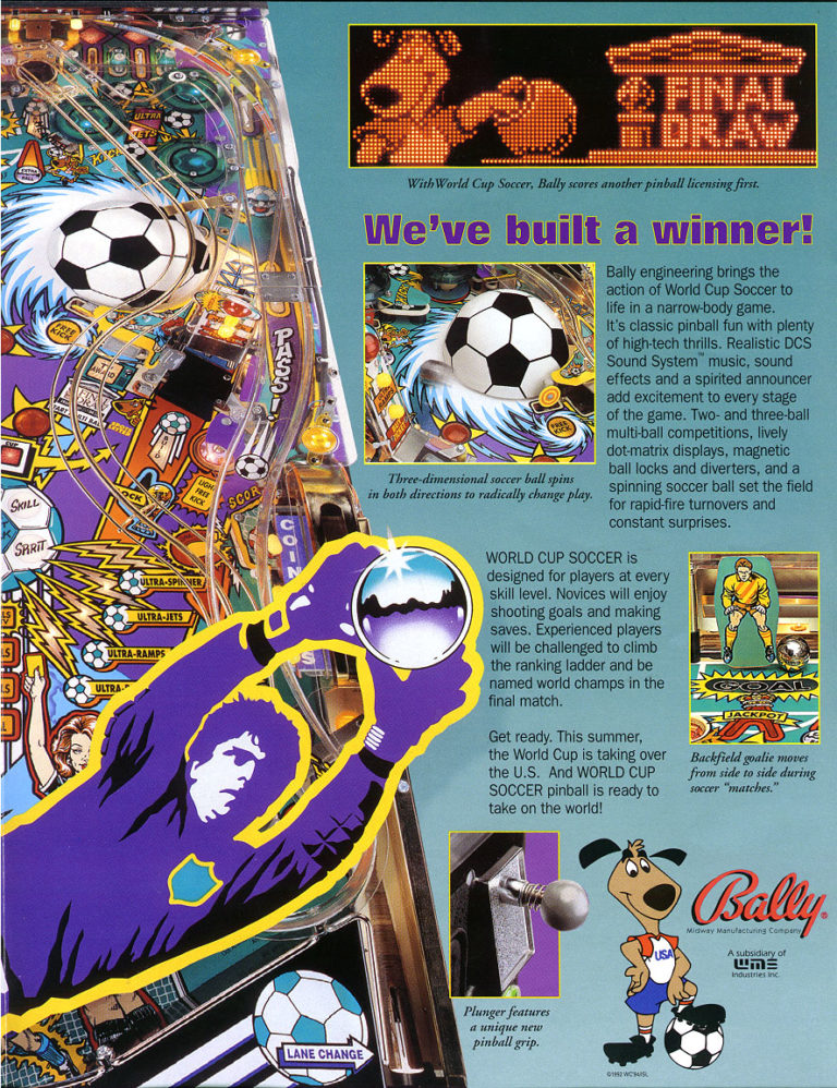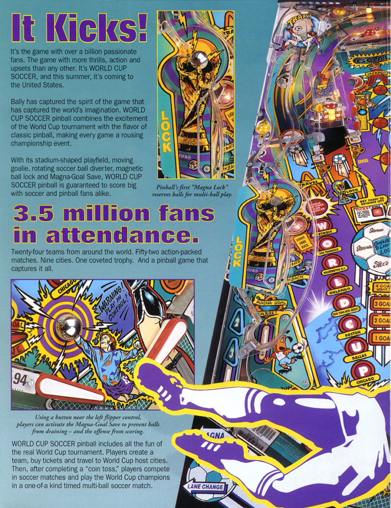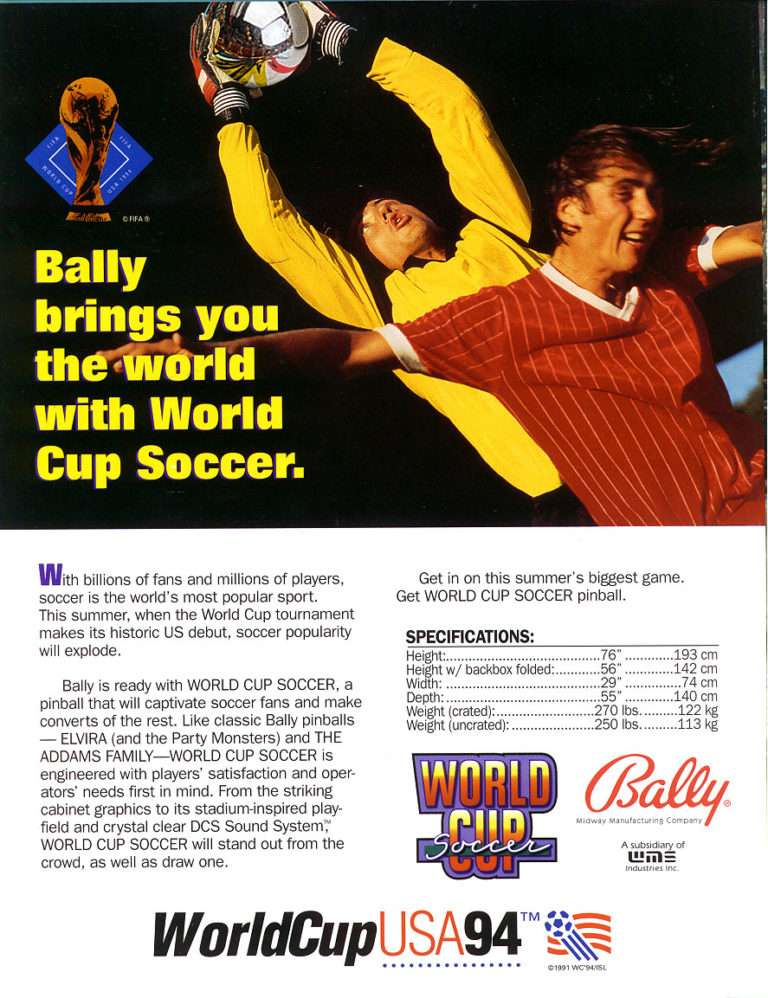 nWorld Cup Soccer pinball machine is based on the 1994 FIFA World Cup. It is a great family pinball machine for those with kids who play sports.